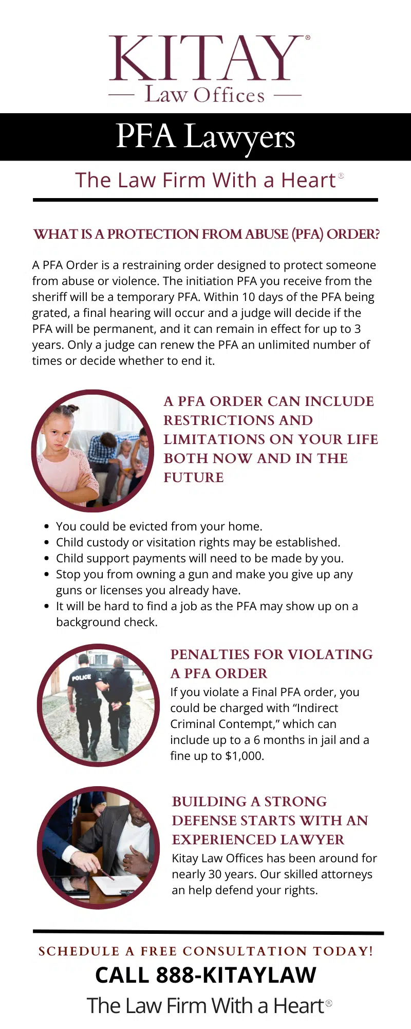 If you’ve been accused of abuse, the alleged victim may seek a PFA in order to obtain a more permanent restraining order. This can affect your home life, work, and relationship with your children. Ensure you contact an experienced PFA Lawyer at Kitay Law Offices for legal representation as soon as possible.